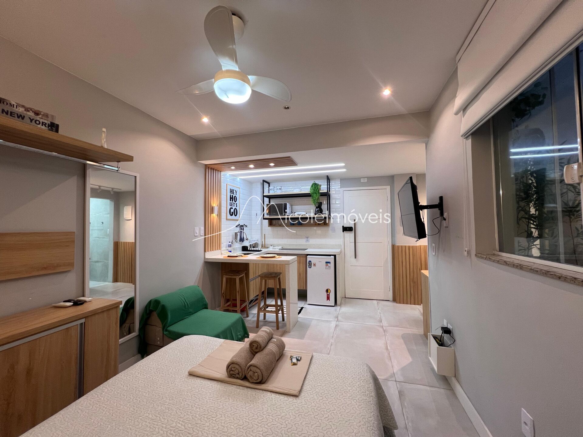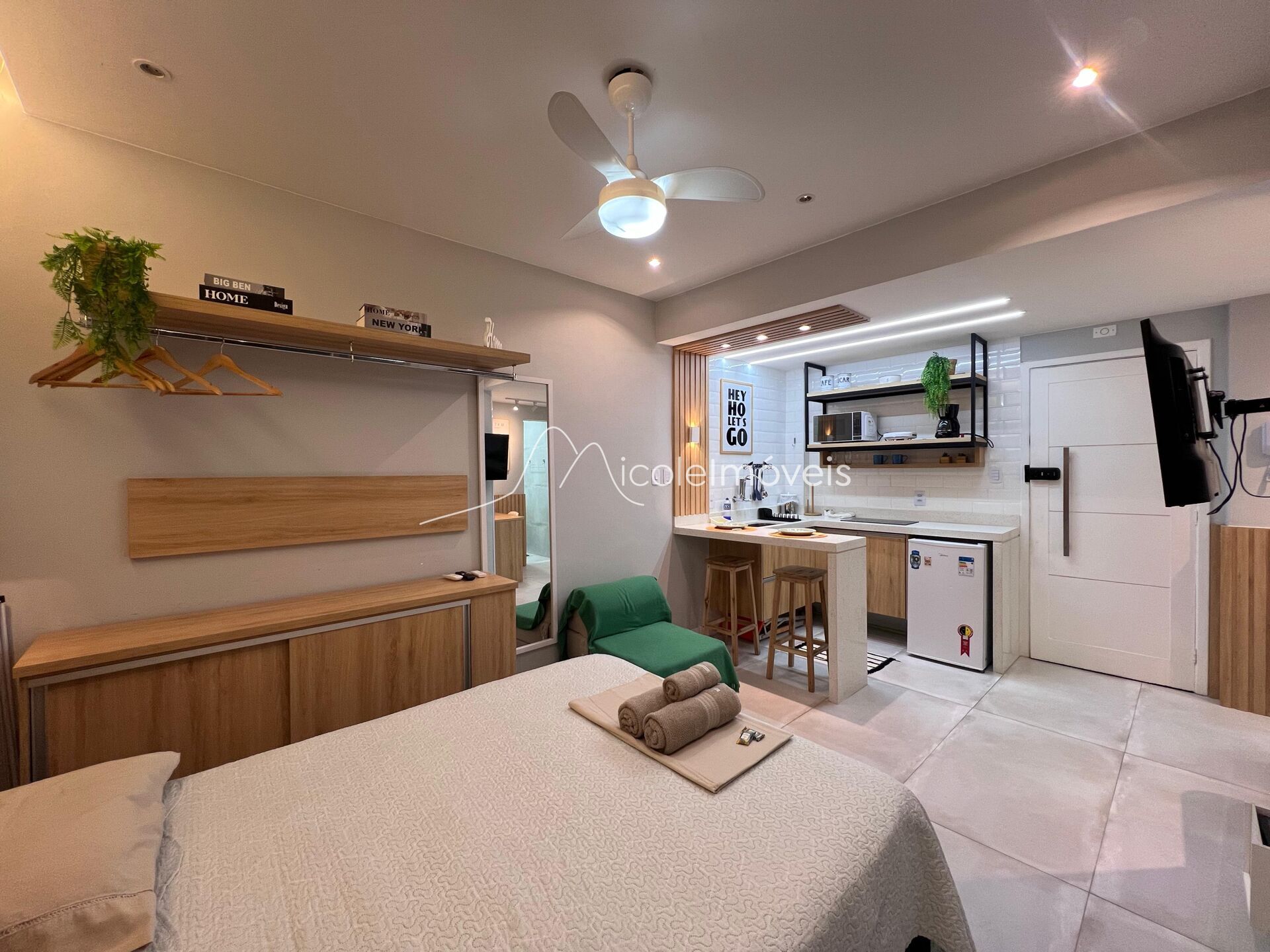 Sala e quarto integrados, cozinha americana e banheiro social.
